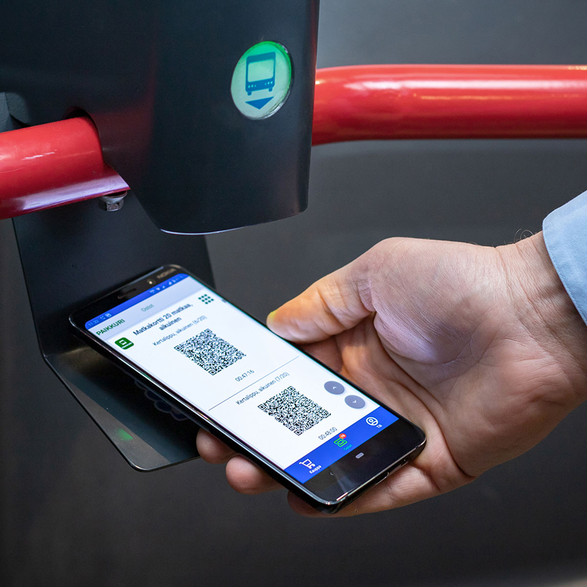 Näytölle aukeava QR-koodi luetaan bussiin noustessa QR-lippujen lukulaitteessa tai se esitetään tarvittaessa kuljettajalle.