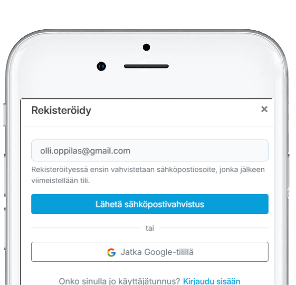 Ensimmäisellä kerralla kirjautuessa tulee sivustolle luoda käyttäjätunnus koululaisen tiedoilla. Tähän tarvitaan käytössä oleva sähköpostiosoite. Rekisteröityessä vahvistetaan ensin sähköpostiosoite, jonka jälkeen viimeistellään tili. Sivustolle voi rekisteröityä myös käyttäen Google-tiliä.